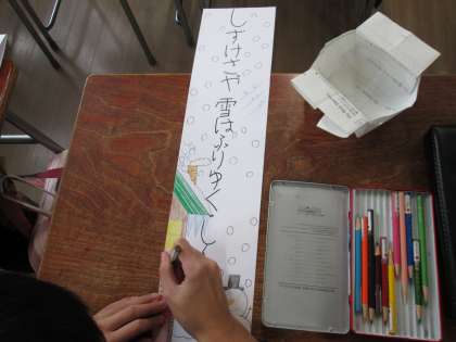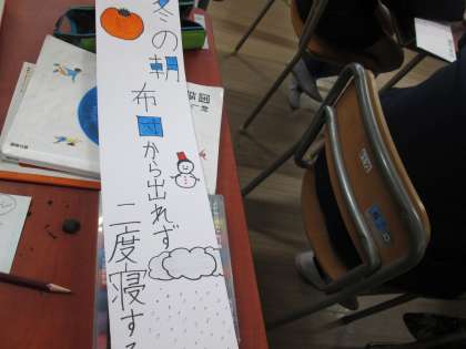 今日はいよいよ俳句の清書です。いくつか作った俳句の中から1つ2つ選びました。1組では、画用紙に早速書きました。伝えたいことが伝わるように工夫できましたか?