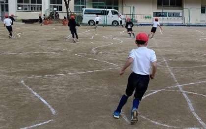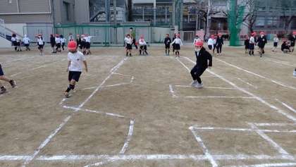 子どもたちのアイデアを取り入れて、「かけっこあそび」のコースをリニューアルしました。これまでよりも長いコースの中に2〜3種類の線が混じっています。みんな、寒さに負けず一生懸命走っていました。