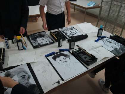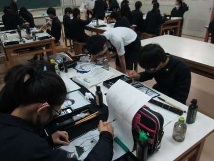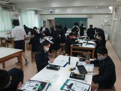 筆や竹串などの細い物と墨汁を使って、歴史上の偉人の似顔絵を描きました。水の量を変えて、色の濃淡を調節しました。子どもたちは初めての経験でしたが、自分なりに表現することができましたね!!