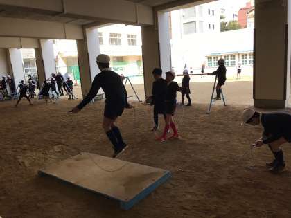 ピロティ下にあるジャンピングボードで縄跳びに熱中!3重跳びが複数回できる人も続々と!