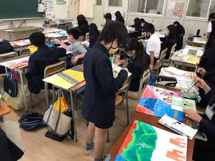 2枚目、図工の様子です。「心に残ったあの時あの場所」自分の中にある描きたい風景を絵の具を使って表しています。グラデーションや点々塗りなどの技法を使って味わい深い作品にしようと集中しています!