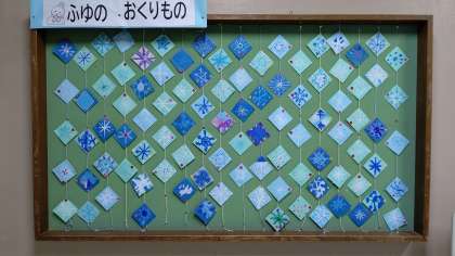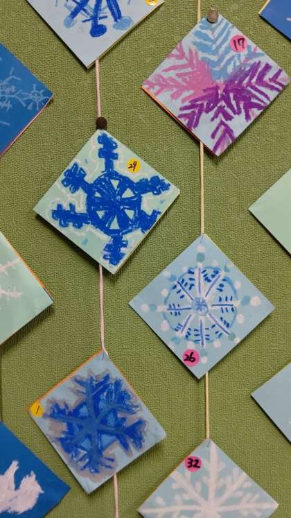 2月のテーマは、(暦の上では立春を過ぎましたが)「ふゆの おくりもの」です。みんな、思い思いの雪の結晶を描きました。