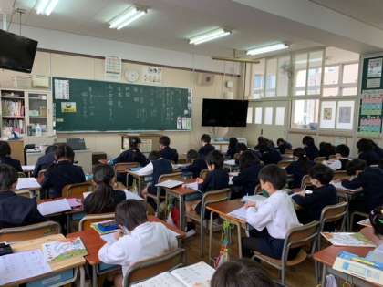 昨日に続き、5時間目は書写です。今回がんばる点は、「画のむき」と「画と画の間の大きさ」に気をつけることです。ほぼ全員直しがなく、丁寧に練習できています。