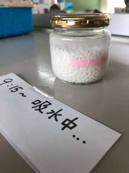 1枚目は、お米の吸水の様子です。調理実習ができないので、ご飯の炊き方やみそしるの作り方を学習したあと、お米の吸水の様子だけ観察しました。1時間経つと一粒一粒がふくらんでいるのが分かりました。
