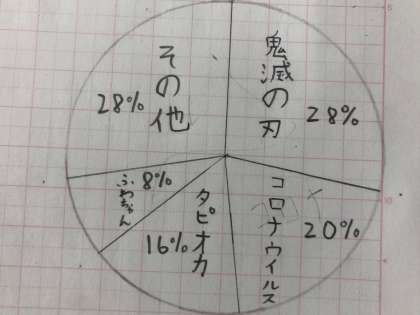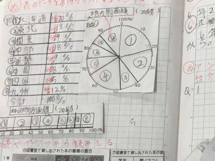 2枚目、3枚目は算数の学習ノートです。帯グラフや円グラフから割合を読み取ったりグラフに表したりしています。自分たちで考えた質問です。アンケートをとって、円グラフにまとめています。
