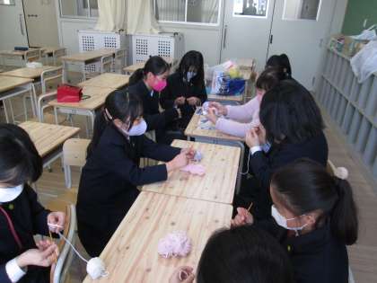 「手芸」は、毛糸を使って手や首につけるアクセサリーなどを作りました。一色だけで作る子。いろんな色を混ぜて作る子。この世で1つだけのアクセサリー!!