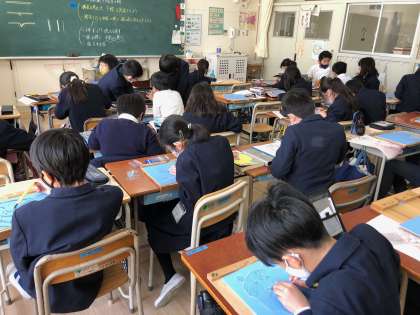 図工の様子です。下書きも終え、いよいよ彫刻刀を使って彫り始めます。一年ぶりの彫刻刀、今年は三角刀以外の刀も使いながら動物の毛並みを表現していきます。彫刻刀の持ち方や彫りの方向など、安全面にも気をつけてゆっくり丁寧に、、、