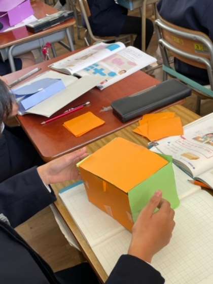算数では「はこの形」の学習です。家で集めてきた箱の面を写しとって箱づくりをしました。