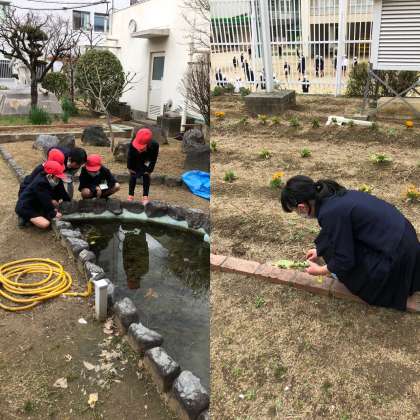 お昼休み、科学園開放の様子です。飼育栽培委員会の5年生が今日は当番でした。すると、一年生が池の周りに!「今日は凍ってないなぁ!あ、たまごおるで!」と話しています。それを見た委員の5年生もにっこり。一年生かわいいなぁと眺めていました。他にもアーモンドの木、オレンジの木があります。アーモンドの殻を拾って掃除をしたり、魚の様子を見たり、水やり等、頑張っているようです。