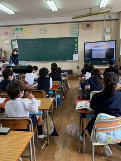 1組は、2年生のふり返りを巻き物にしたものが遂に完成したので、読みあっています。2組は、生活科のテストです。「じまんしたいことやできるようになったことは何ですか。」の質問に、あれこれ考えています。3組は、人権教育「手やゆびではなそう」を学んでいます。目の不自由な人の名刺に点字があることに驚いています。