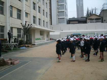 今朝の児童朝会。校長先生からは土曜日に行われた地域の防災訓練の模様を紹介され、大災害が起きたときに自分の命は自分で守ることが大切であるとともに、地域の人と協力して救助や避難活動をすることが大切であり、中大江地域の素晴らしいところは防災訓練や各種の行事に率先してお手伝いをしてくださる方が沢山おられることであることであり、これからも色々な機会に来校される地域の方々に感謝の気持ちを忘れないでほしいとのお話がありました。また安全当番の先生からは、先週の4・5・6年年によるあいさつ運動が好評を収め、校内に活気と笑顔の輪が広がったのでさらに続けて取り組もうと話されました。