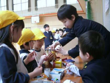 5時間目。講堂で2年生と中江大江幼稚園きく組とバラ組園児との交流会が開かれました。今日は2年生が生活科で作った手作りおもちゃを作ったので、そのおもちゃを使って楽しく遊びました。