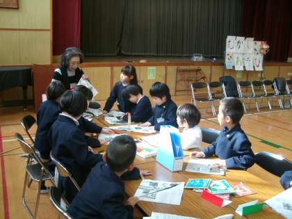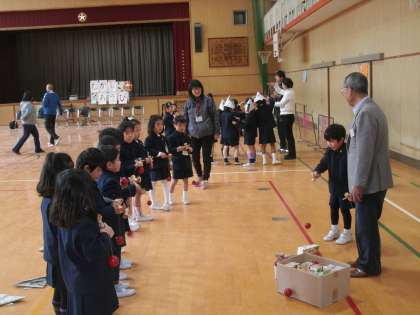 2時間目。1年生を対象にした地域の方々による恒例の「昔遊びを教えて」の会が講堂でにぎやかに開かれました。「あやとり」や「けん玉」「折り紙」「おはじき」「お手玉」など、子どもたちが一度は慣れ親しんだ昔遊びを昔遊びのプロともいえる地域の方に丁寧に教えていただきました。