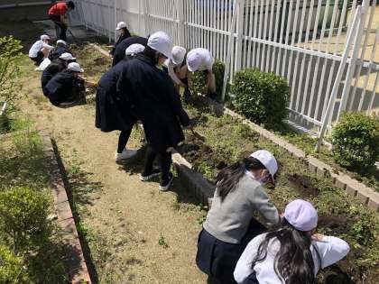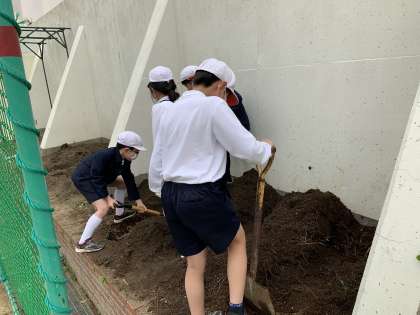 学習園に生えた雑草を抜いたり、植物を植えるために土を耕したりしました。