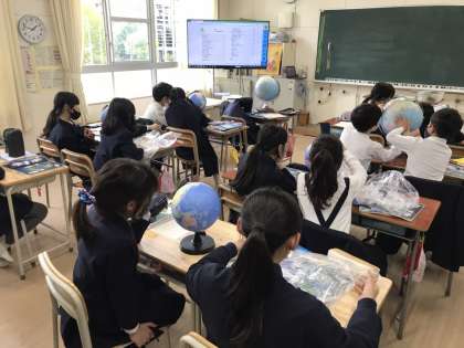 地球儀を使って世界からみた日本の位置やそれぞれの大陸にはどのような国があるのか調べました。