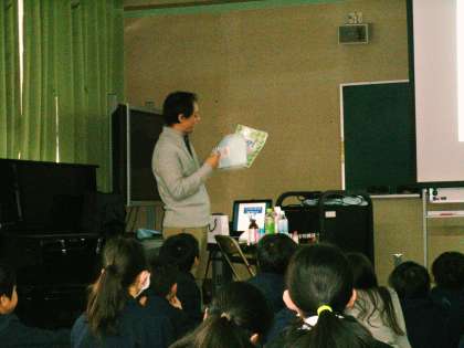 6時間目。6年生を対象にして、学校薬剤師の宇野彰先生による薬の使い方教室が開かれました。身近な薬を使って果物との反応の実験を見せていただきました。またプロジェクターを使って丁寧に薬の使い方を教えていただきました。子どもたちも実験の薬品の変化に興味を持って真剣にビーカーを見つめていました。