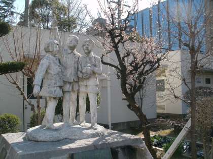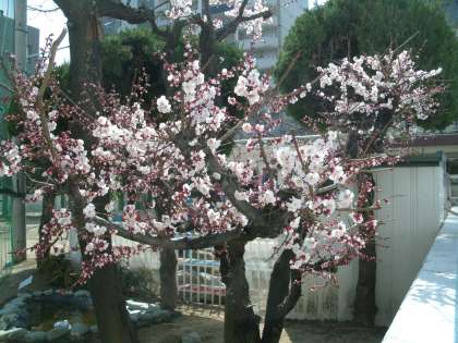 ふと校舎から運動場を眺めると、メダカ池近くの木がまるで桜の花が満開のようにピンクに染まっていました。都会とはいえいくらなんでも早すぎるのでは、と思いつつ目をこすって近づいてみると、桜の花によく似た梅の花びらが満開でした。