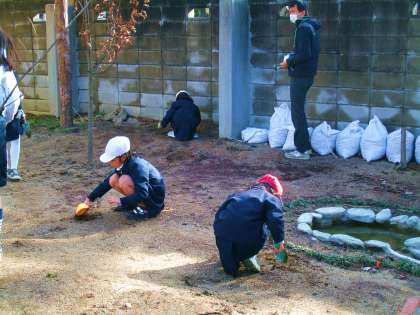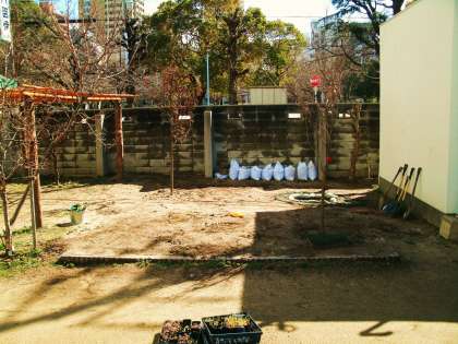 今はまだ何もないただの空き地ですが、これから春から夏へと季節が変わるたびに、どんな草花や昆虫たちの世界が誕生するか楽しみです。都会の中の限られた空間でメダカ池やどんぐり広場などの自然とふれあう環境づくりへの中大江の挑戦はこれからも続きます。