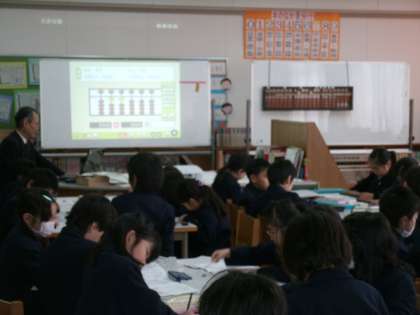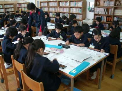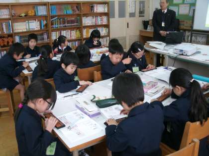 2・3時間目。図書室では3年生がそろばんの授業をしていました。今日は大阪珠算教会の益田先生を講師に招き、電子黒板を使っての学年合同の一斉授業形式でした。電子黒板だと全員が画面を見ながら自分のそろばんと確認しながら進めるのでそろばんの指導には効果を発揮していました。そうとはいえ、そろばんが初めての児童にとっては玉の動かし方に慣れるまで目を白黒させていました。