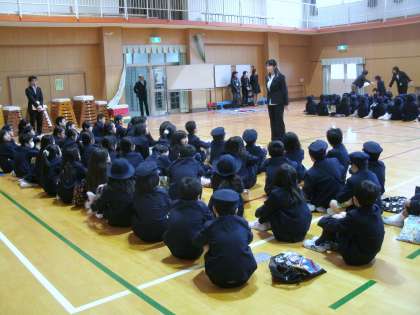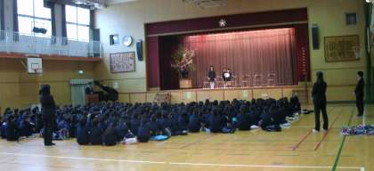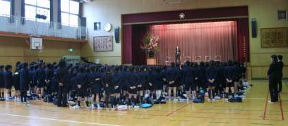始業式では、校長先生から入学式での新入生のがんばりや2年生の歓迎演技に対して地域の来賓の方から大変喜んでいただいたことなどを紹介された後、新学期にあたり自分の目標をしっかりと立て、毎日少しずつ努力をしていけば必ずどんなことでも目標に近づくことができると話されました。続いて、各学級の担任発表が行われました。