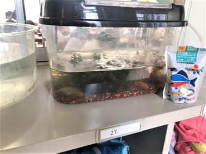 6年生の教室の前には金魚とドジョウがいます。