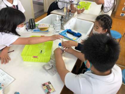 理科の授業では、しょうゆや、酢、せっけん水など身の回りのものの