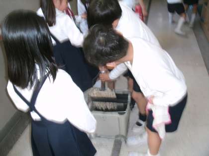 ◆中:雑巾モップの水切りは1年生にとっては重労働です。