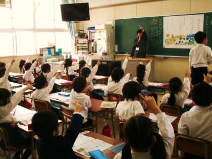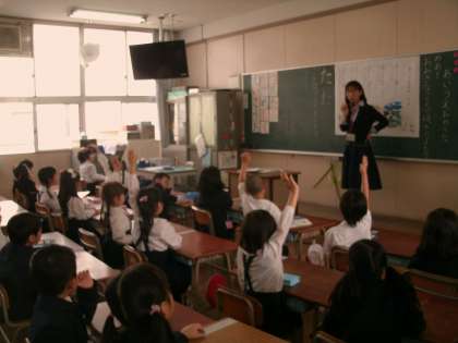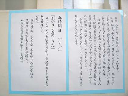 5時間目は初めての学習参観。国語の教材「あいうえおのうた」を使って、音読やひらがなの学習の様子を見ていただきました。でも、やはり親御さんの様子が気になるのか、後ろを振り返りながら学習している子が多かったようです。