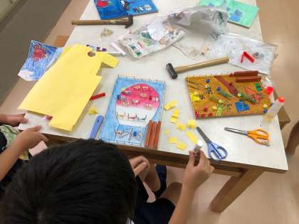 輪ゴムを通したり、くぎを打つ場所を工夫したりして面白いゲームを作っています。