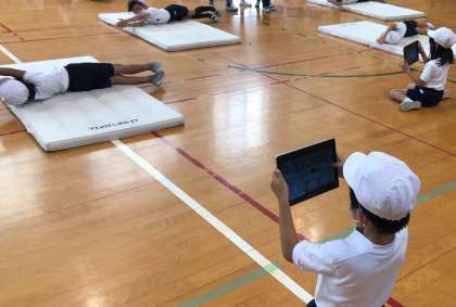 友だちにタブレットで自分の姿を撮ってもらい、確認していました。