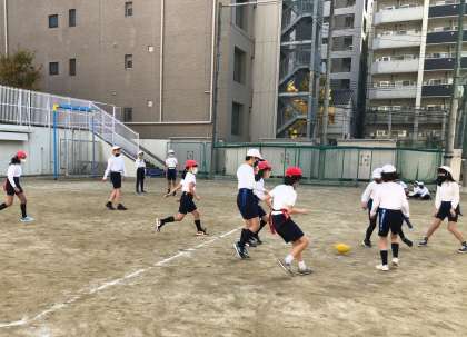 不規則に転がるラグビーボールを追いかけながら、元気いっぱい