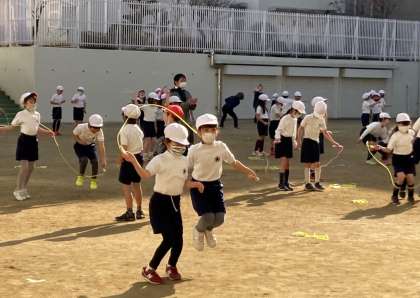 今日は、ペアで1本の縄跳びを跳ぶ運動をしていました。