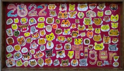 1月の玄関掲示は,2年生が担当しました。子どもたちが描いたトラが大集合して3学期のスタートを待っています。