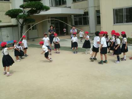 2時間目の休み時間。日差しの厳しい運動場に元気よく飛び出したのは1年生。なんと先生の手を借りずに、自分たちで長縄を回し、仲良く跳び続けていました。