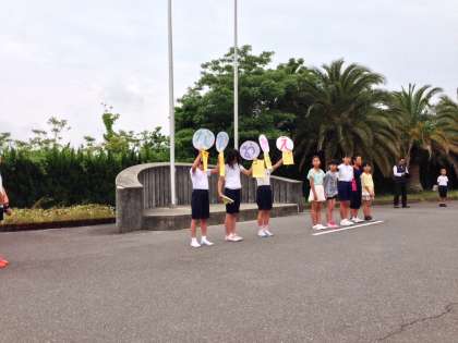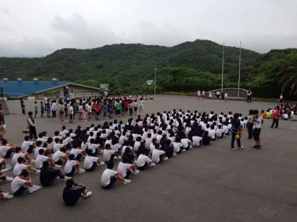 午後5時。太陽が西に傾き、潮風の香織が漂う集いの広場において、国立淡路青少年の家を利用する他校の児童とともに、夕べの集いが開かれました。