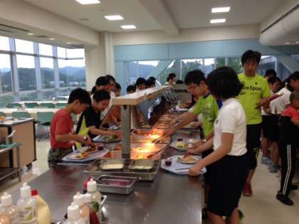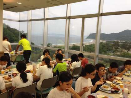 午後6時30分。自然体験の1日目の初めての夕食です。夕焼けに染まる海と山に囲まれた最高のロケーションで、バイキング形式で好きなメニューを各自がチョイスして美味しくいただきました。
