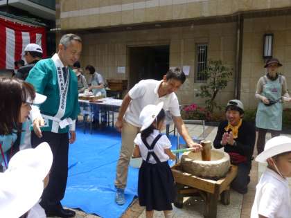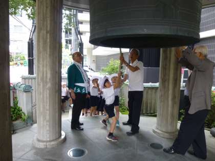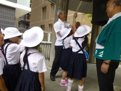 毎年この日には、1年生と幼稚園児が招かれて、地域の方々と一緒に釣鐘堂の鐘を打たせてもらって記念日をお祝いしています。あらためて釣鐘堂の保存に汗を流された地域の先人達のご苦労に頭が下がります。