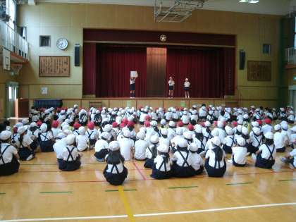 今朝の集会は、子どもたちに大人気の未確認飛行物体ゲームでした。2mほどのカーテンの隙間で飛び交うボールやぬいぐるみなどの物を当てるゲームです。