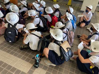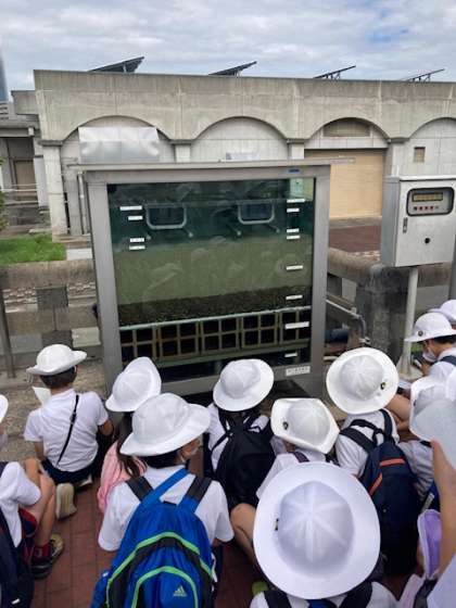 広い浄水場の敷地を3クラスに分かれて見学しています。