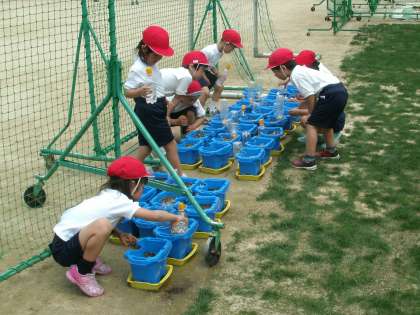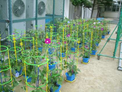 5月から1年生が朝顔の種を植えてから約2か月。毎朝、運動場では子どもたちが水やりをしながら「早く大きくなってね」と語りかけて世話をする姿が見られました。