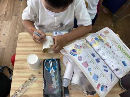 いろいろな空き容器を組み合わせておもちゃを作り上げていました。