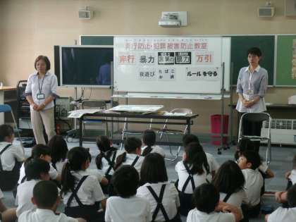 今日の授業では、夏休みを前にして繁華街での夜遊びや万引きが非行につながることを強調されました。子どもたちも、「万引きは万引きを見ている人も同じ罪だとわかったので見て見ぬふりはしない」と担任に感想を語っていました。