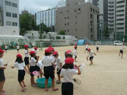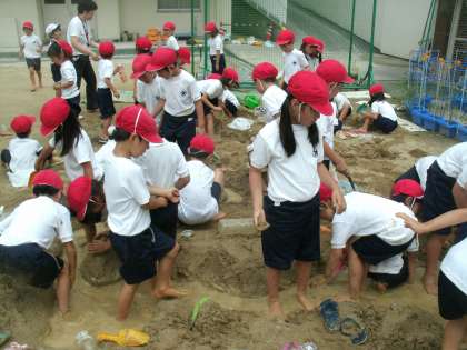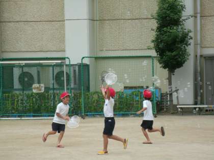 3時間目。1年生は生活科「水であそぼう」での学習で、砂場で泥んこ遊びをしたり、運動場で色々なシャボン玉を作って飛ばしたりと、水や土とふれあって思う存分楽しい時間を過ごしました。