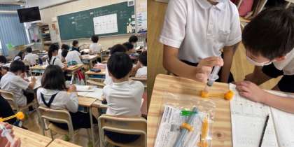 理科の学習では、閉じ込めた空気について学んでいます。空気を押したり縮めたりしていました。