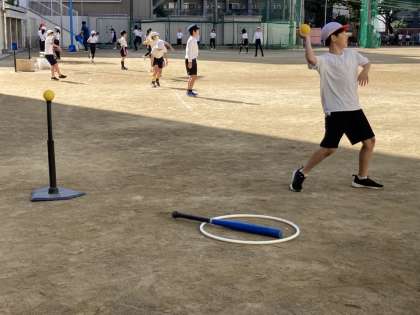 体育ではベースボール方ゲームに取り組んでいます。止まっているボールを打つのも意外と難しいようてす。