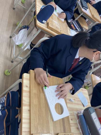 図画工作では、彫刻刀を使った学習をしています。下絵に沿って細かい線を彫刻刀を使い分けて彫り進んでいました。