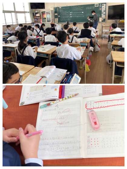計算の決まりを使って問題を解いていくという算数の学習のようすです。和差積商それぞれのきまりを考えながら解き進めています。