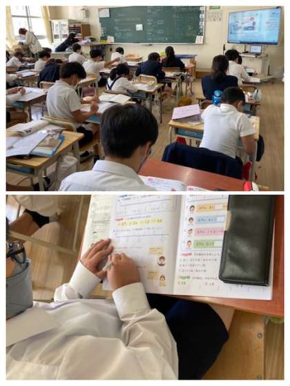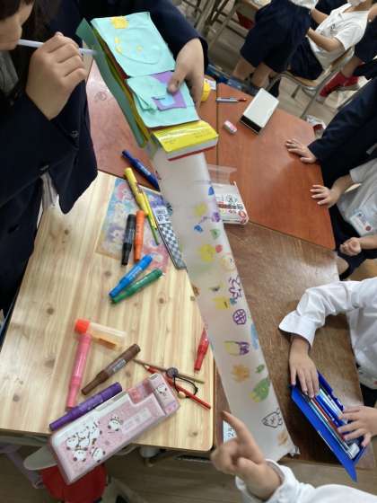 図画工作では、いろいろな材料を組み合わせて作品を作っています。写真の子は大小の箱を組み合わせてびっくり箱を作っていました。