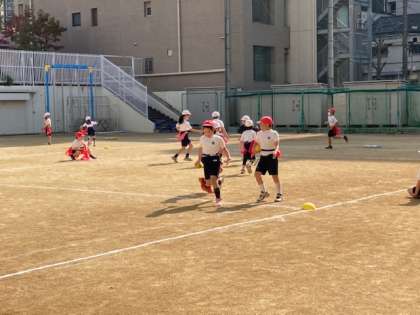 いま体育で練習しているフラッグフットボールのようすです。ルールも浸透して、避け方やフラッグの取り方など、とても上達しています。