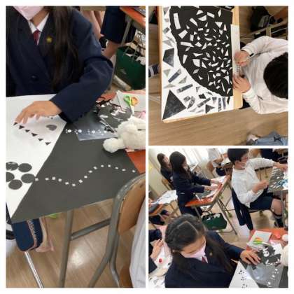 図画工作の作品が徐々に完成に近づいています。材料2色の画用紙だけですが、とても華やかな作品が仕上がっています。